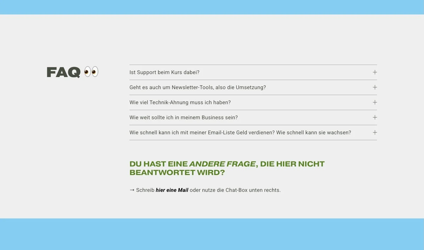 Gerade bei Angeboten, Kursen oder Services hast du oft viele Infos - aber willst die Seite nicht überladen. FAQs zum Ausklappen halten alles übersichtlich - und steigern die Conversion, weil deine Leser die wichtigsten Infos easy finden.